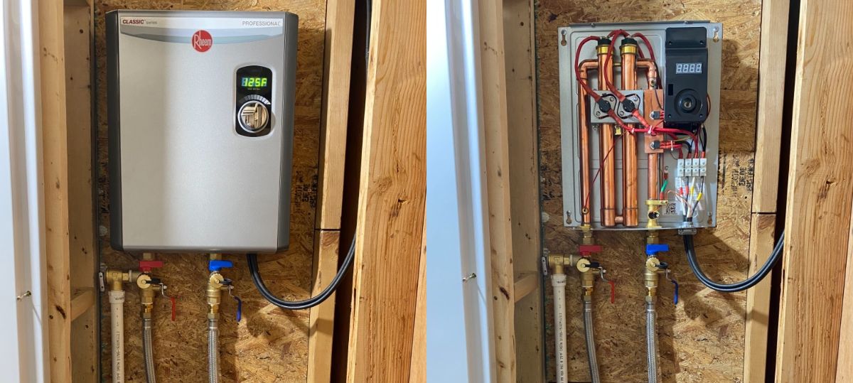 In the end, I settled on an 18kW Rheem. EcoSmart is also highly reviewed, but I read that it’s essentially a rebranded Rheem (similar to how DeWalt and Black & Decker are related). Installation was incredibly easy, and the unit is compact, freeing up space—another great bonus. It cost half as much as a traditional tank heater. However, if you can’t do the installation yourself, be prepared for higher costs. Running new electrical wiring and making plumbing adjustments is necessary, but manageable. Expect to spend around $60 for a valve kit, $50 for SharkBites and PEX, plus additional costs for 8-gauge wire (which can add up for longer runs). This model requires two 40-amp breakers.